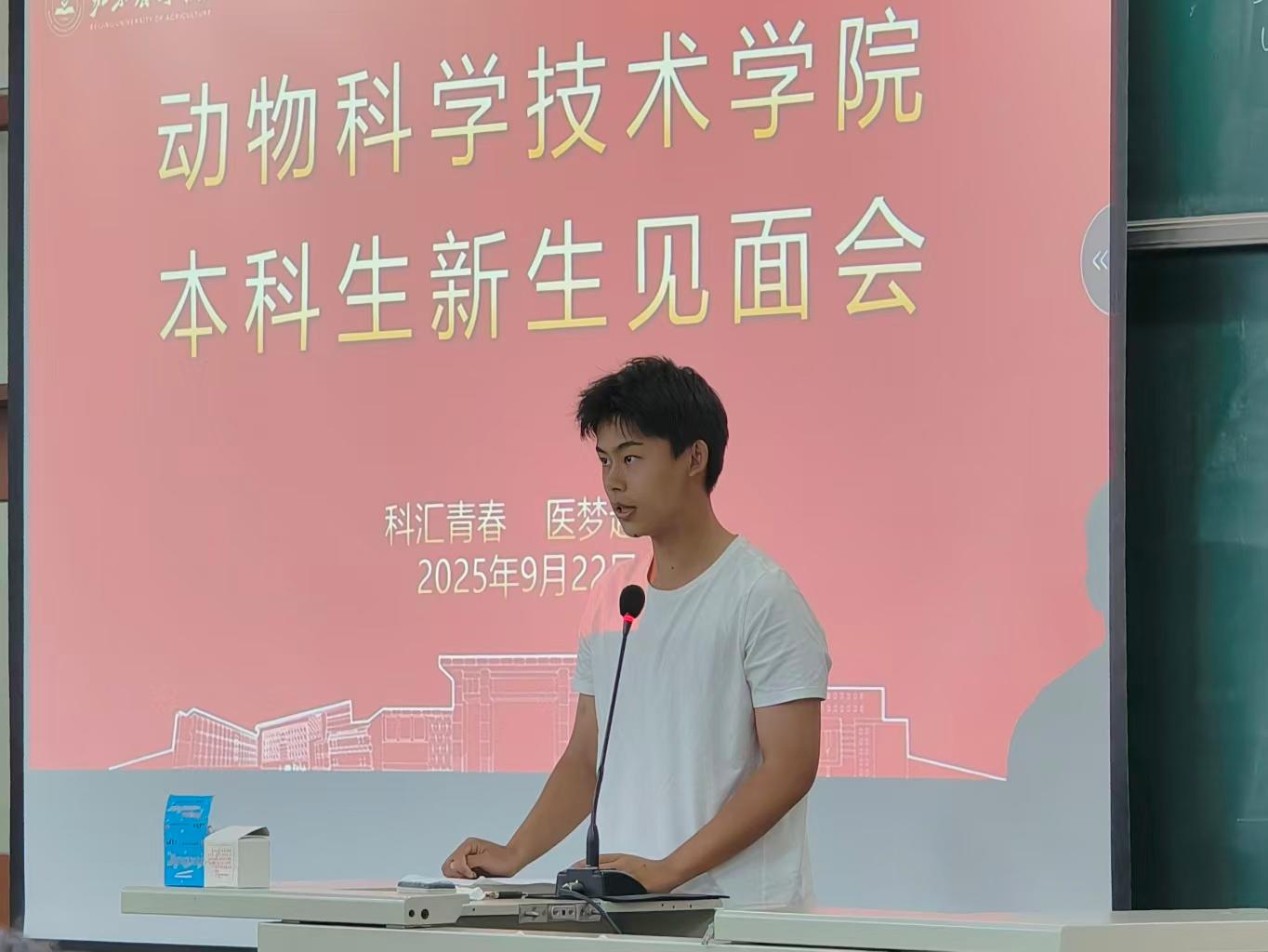 副院长刘明对新加入动科动医学院的25级新生表示欢迎,他围绕学院学科建设等核心内容,系统介绍了学院概况,有效加深了新生对于学院的认知和了解。他叮嘱学生在学习和生活上要互帮互助,发扬军训期间的团结精神。大一新生最重要的就是不能懈怠,要充分利用早晚自习时间夯实学业基础,课外时间多参加社会实践,在实践中学真知、悟真谛,锻炼提升自己的综合实力。