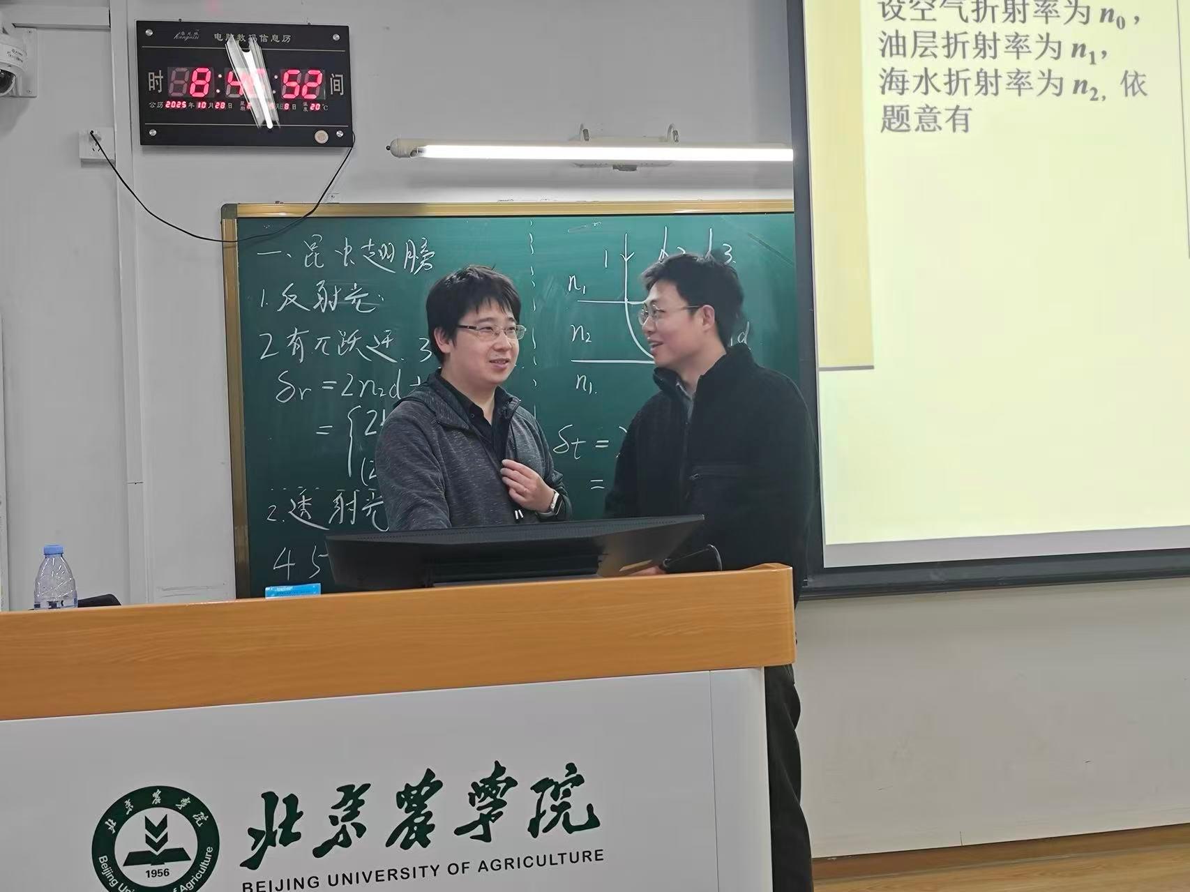 凡震老师在《普通物理学》课堂上认真记录,并与任课教师深入交流,全面了解学生课程学习情况。