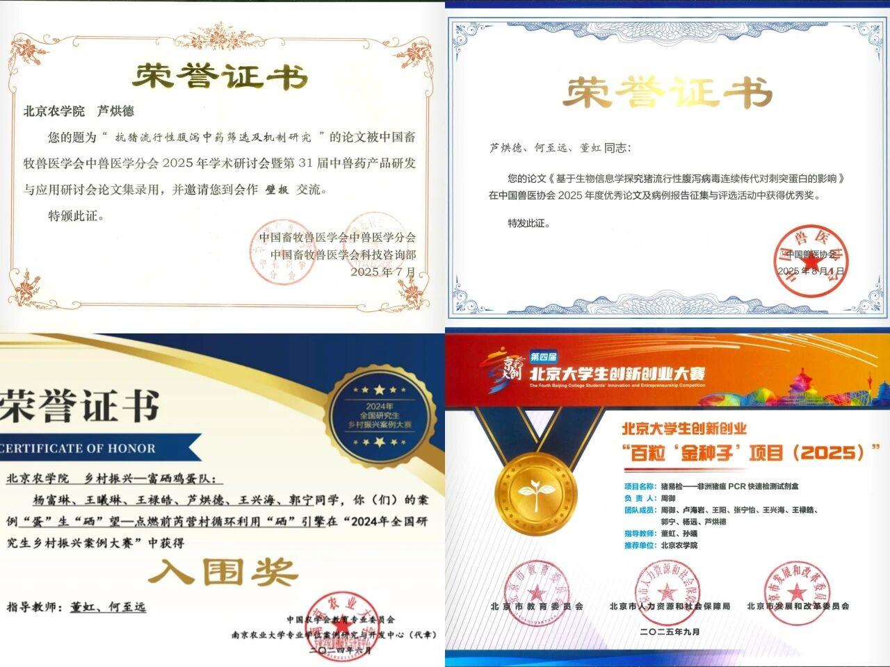 参与发表学术论文8篇,其中,以第一作者/共同一作发表SCI2篇,CSCD1篇;获第四届“京彩大创”北京大学生创新创业大赛等省部级竞赛奖14项;获2023-2024学年研究生三等学业奖学金、2024-2025学年研究生二等学业奖学金、2025-2026学年研究生一等学业奖学金、国家奖学金。