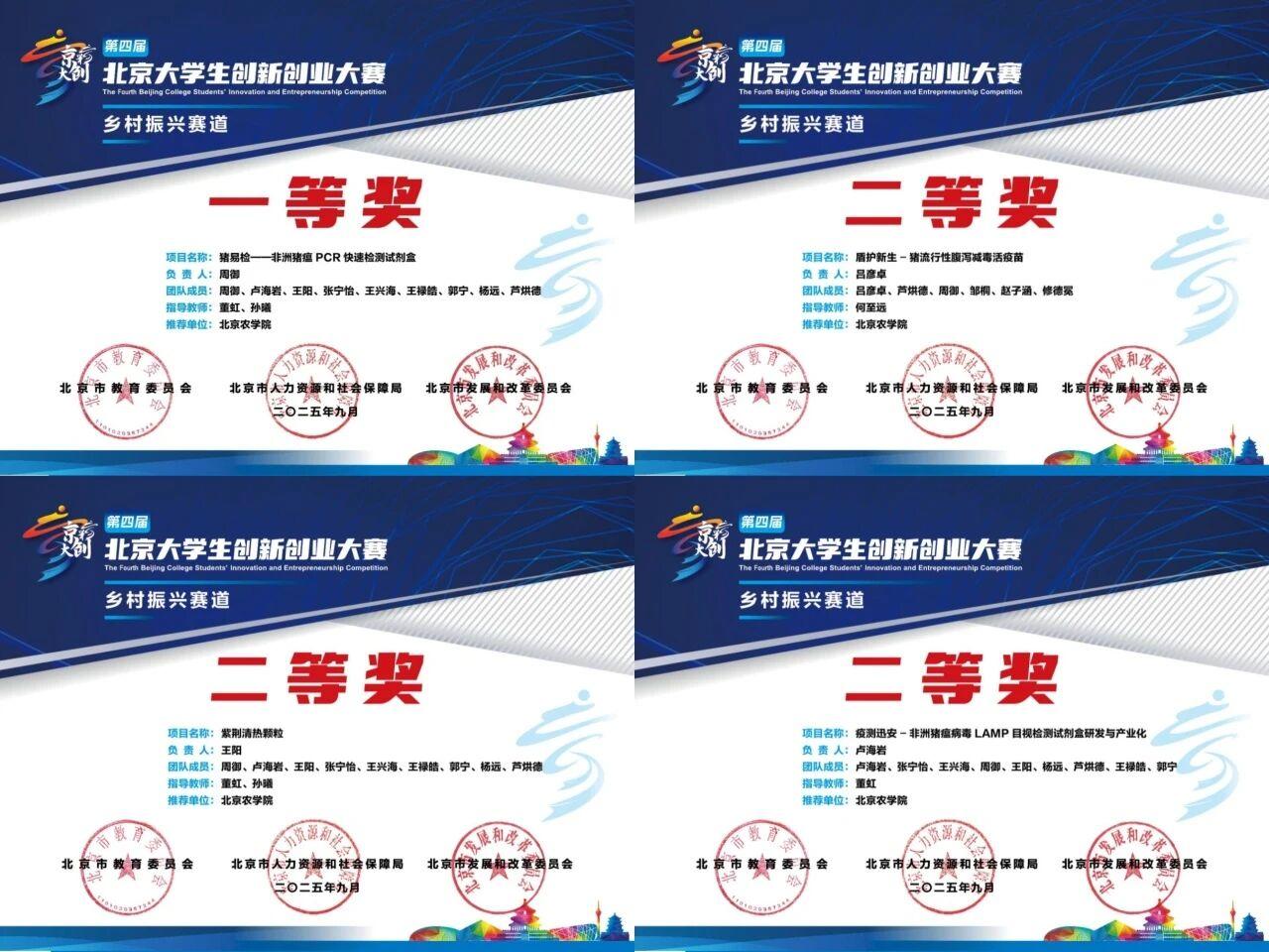 3.第四届北京大学生创新创业大赛乡村振兴赛道二等奖(盾护新生-猪流行性腹泻减毒活疫苗)