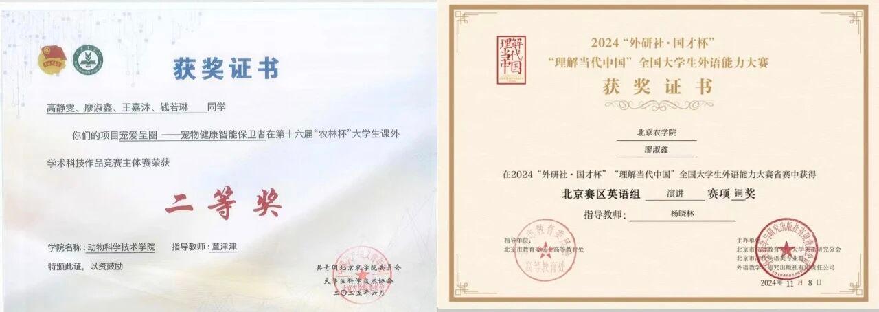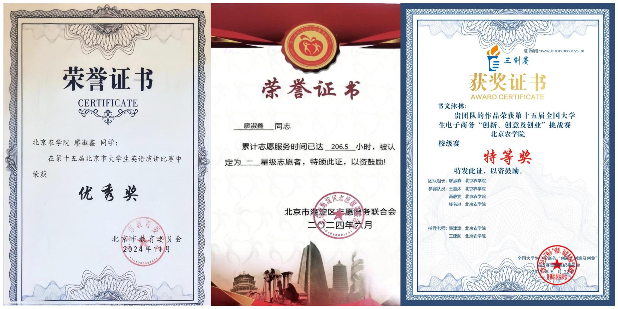 廖淑鑫,2023级动医专业,共青团员,曾任院青协项目部部员,获得三创赛校赛特等奖(队长)、农林杯校赛二等奖(挑战杯)、24年11月外研社杯市赛三等奖。