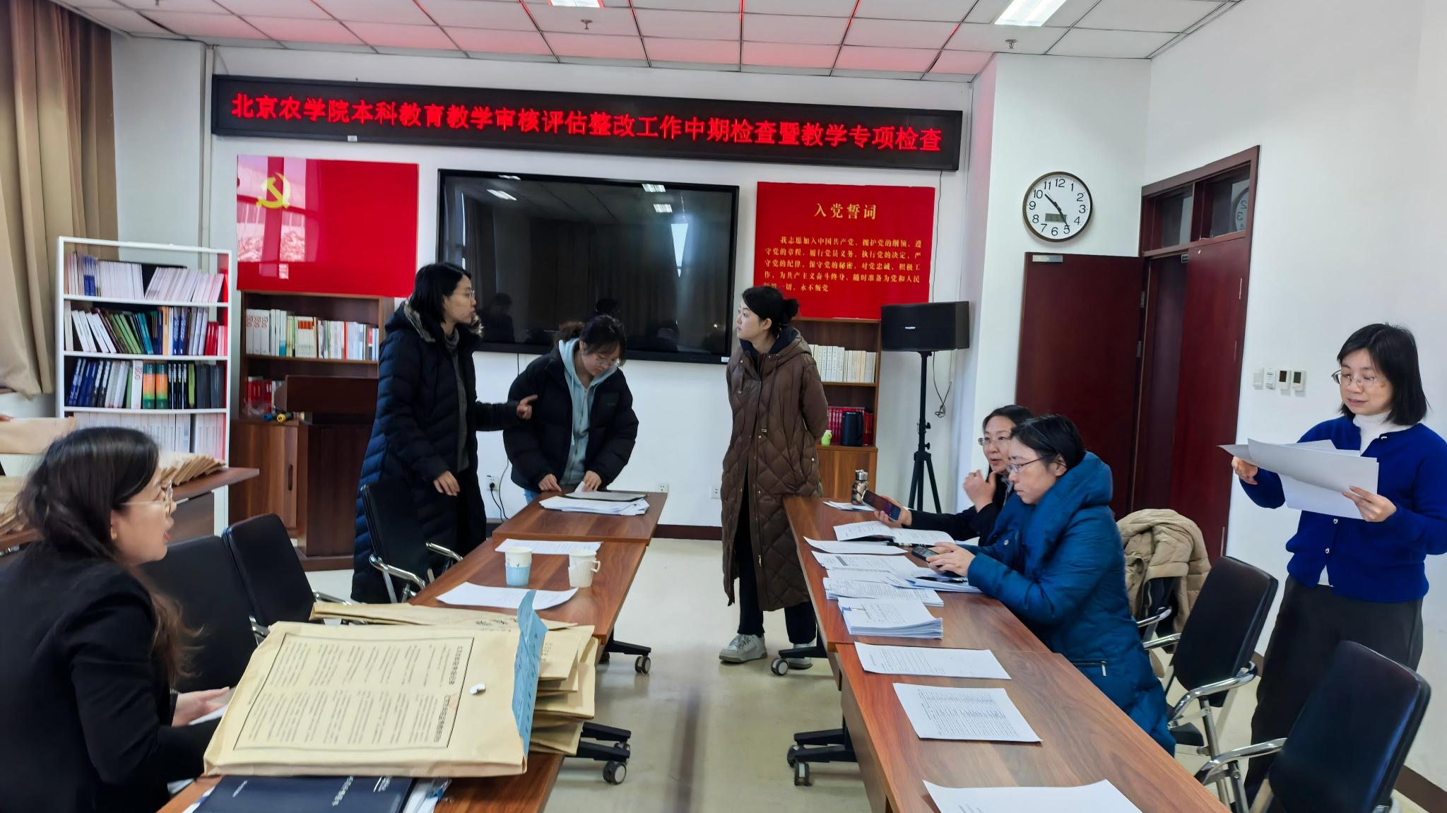 检查组在动科楼313会议室对教学档案进行了现场审阅,重点检查集体备课记录、教学档案材料及课程梳理报告等内容。针对发现的问题与不足,现场反馈并提出具体改进建议。