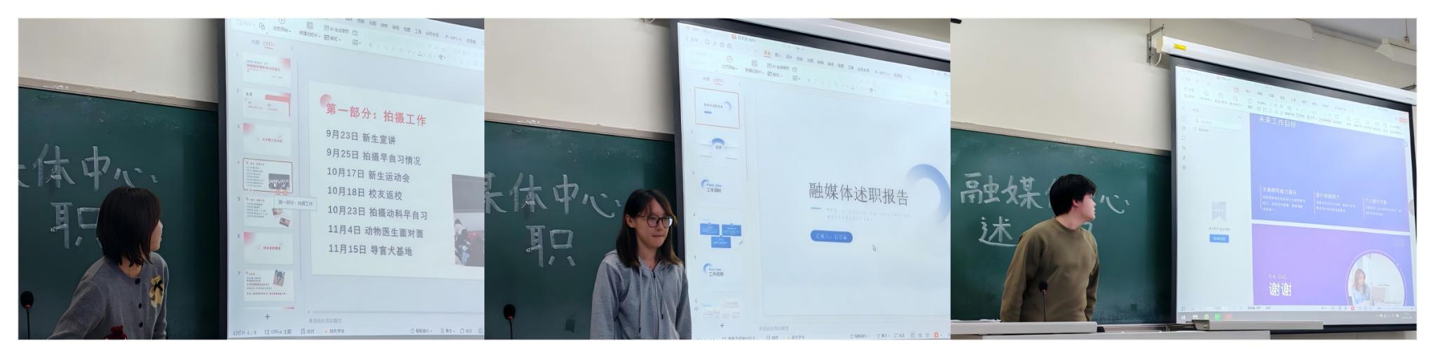 各组员通过PPT演示,简要汇报了个人在具体工作中承担的任务、面对多种任务的不足、收获的成长以及对未来工作的展望,展现了融媒体中心新生力量的思考与进步。