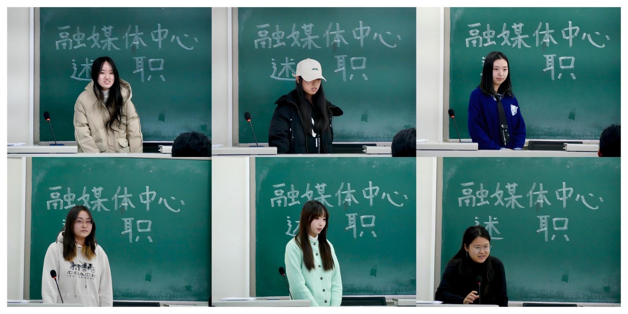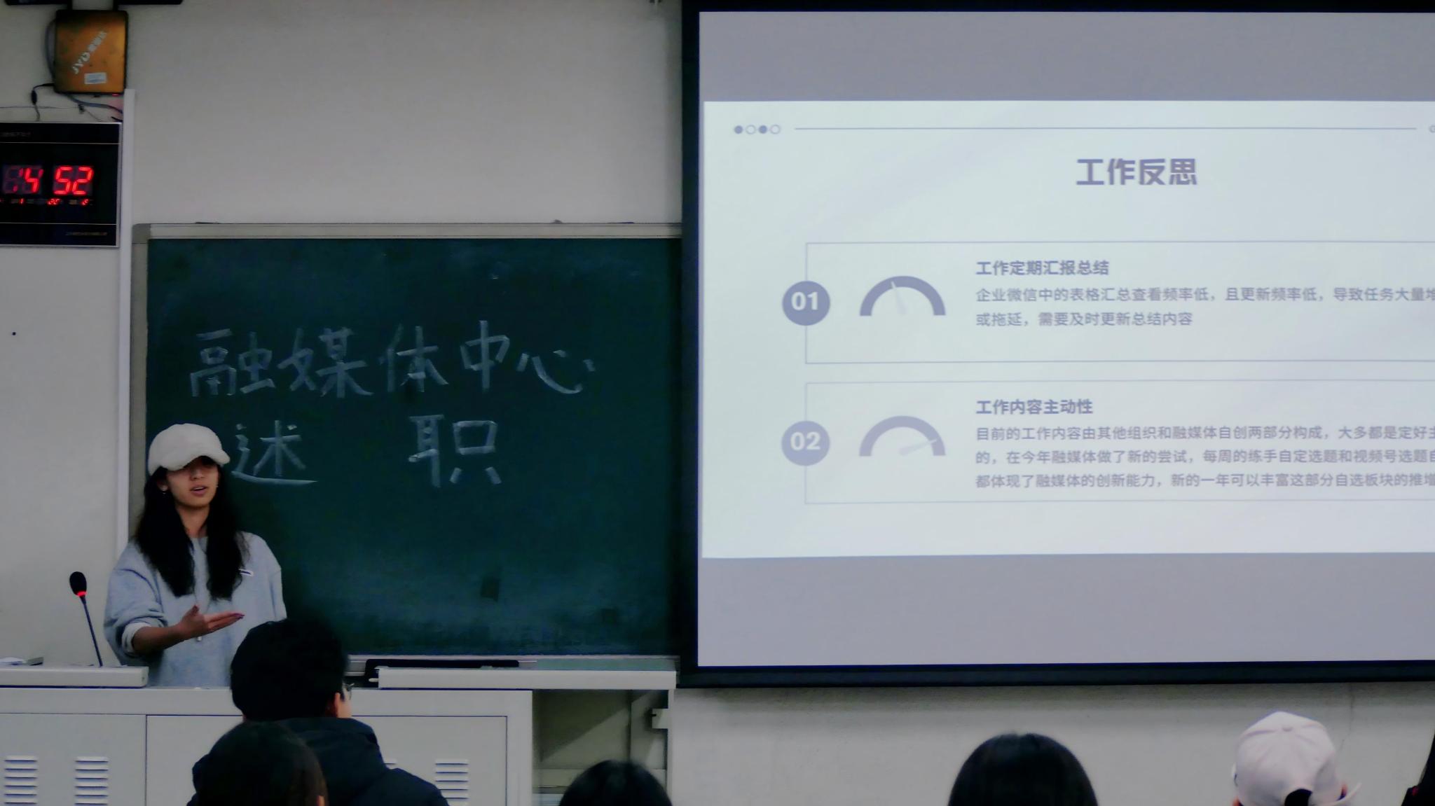随后,主任张欣雨进行工作述职,全面回顾融媒体中心在组织建设、内容创新方面的成果。她重点介绍了本学期创新的工作模式:学期初保持部门化运作,发挥专业深度优势;学期中打破部门界限,将全体成员重组为3个综合工作小组,每位同学都需全面参与文案、摄影、排版全流程。她提到,改革初期面临技能转型、协作磨合等挑战,但同学们展现了极强的学习能力和团队精神,主动克服专业局限,快速适应了全流程工作要求,同时也指出了跨组交流不足、信息回复不及时等问题。
