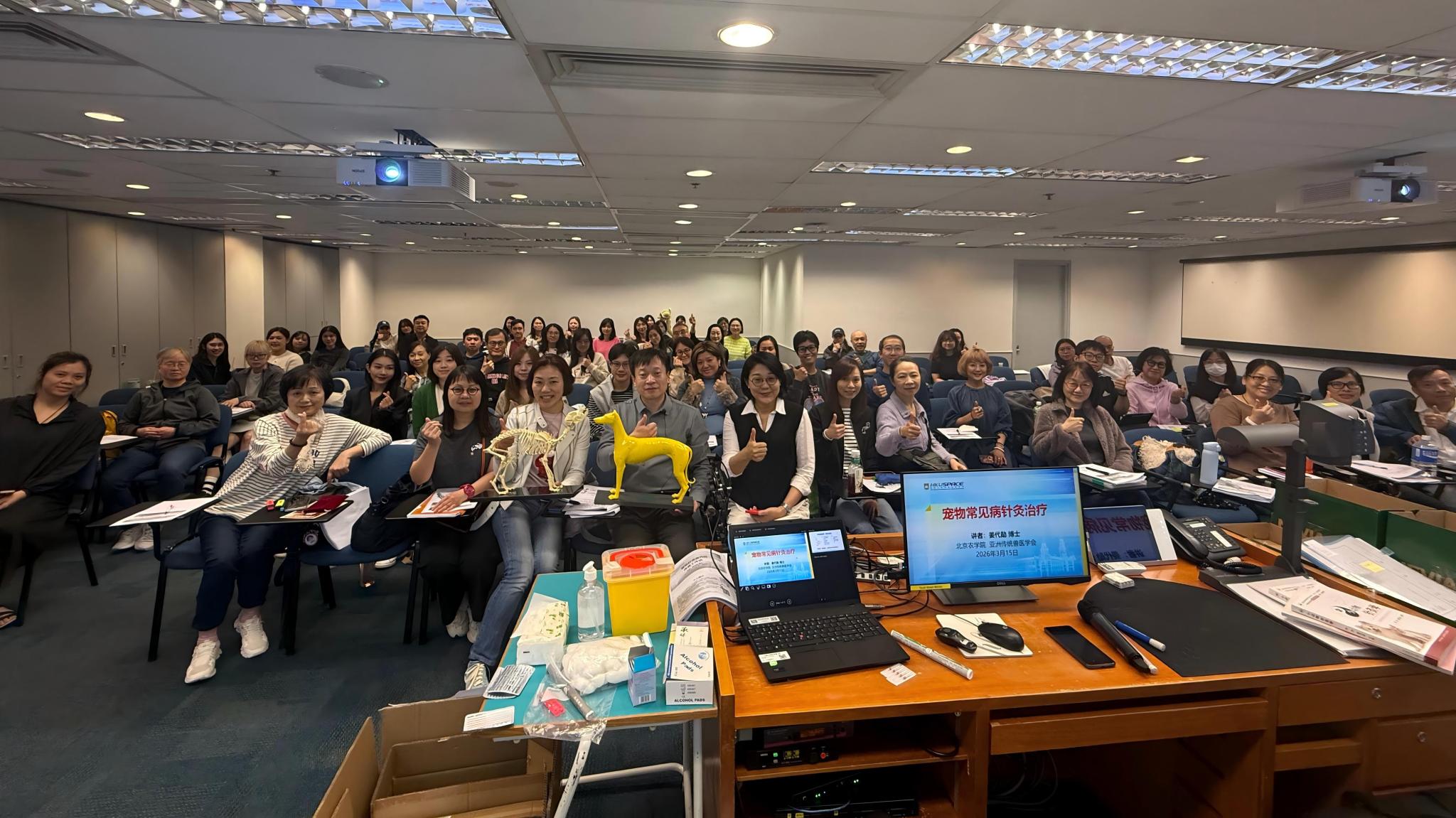 如今,宠物已经成为都市生活的一部分,它们的健康和医疗服务正在逐步完善中。针灸作为副作用小的物理疗法,不仅在马、牛等大动物被兽医广泛应用,也在现代宠物治疗中日渐受到欢迎。本次教学指导活动取得了良好的教学效果,学生们纷纷表示课程精彩、充实,受益良多,现场不少学生还咨询了教材和教具等知识信息。在学院及学会支持下,姜代勋副教授将继续与港大进修学院开展合作,在香港特区推广宠物针灸技术及进阶实操课程,推动我院小动物针灸学科在香港特区的持续影响力。